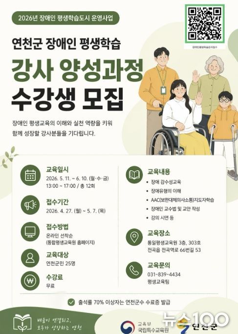 뉴스100 김동초 기자 | 연천군은 교육부 국립특수교육원이 주관하는 '2026년 장애인 평생학습도시 운영 지원사업' 공모에 선정됨에 따라 장애인 평생교육 현장형 강사 양성 과정을 운영한다.