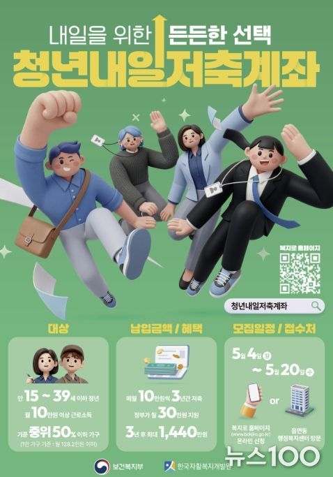 뉴스100 김동초 기자 | 부천시는 일하는 저소득층 청년의 안정적인 사회 정착과 자산 형성을 지원하기 위해 ‘2026년 청년내일저축계좌’ 신규 가입자를 5월 4일부터 5월 20일까지 모집한다.