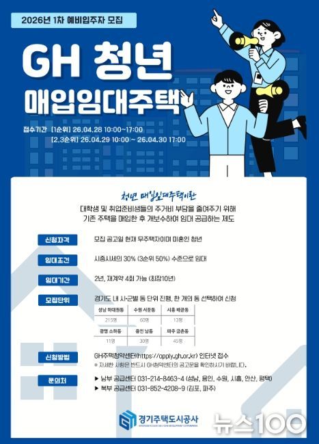 뉴스100 김동초 기자 | 경기주택도시공사(GH)가 청년층 주거 부담을 덜고 안정적인 생활 기반을 마련할 수 있도록 청년 및 자립준비 청년을 위한 매입임대주택 예비입주자 396명을 모집한다고 27일 밝혔다.