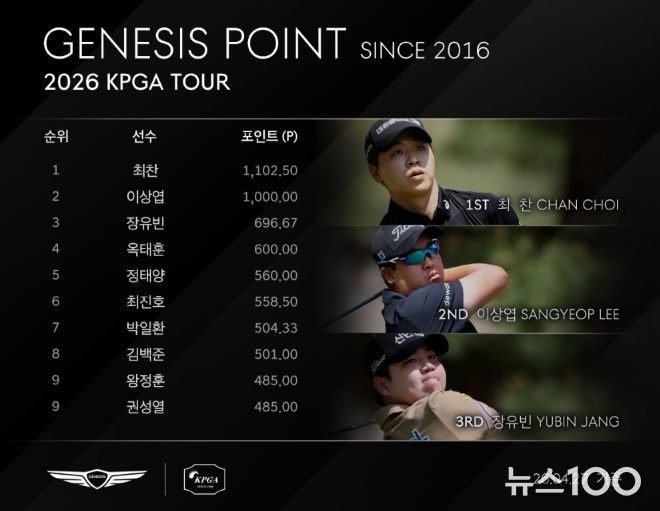 최찬은 ‘2026 우리금융챔피언십’에서 최종합계 13언더파 271타로 우승해 제네시스 포인트 1,000 포인트를 추가한 1,102.50 포인트로 단숨에 제네시스 포인트 1위에 올라섰다. 최찬이 제네시스 포인트 1위에 위치한 것은 2022년 투어 입성 이후 최초다.