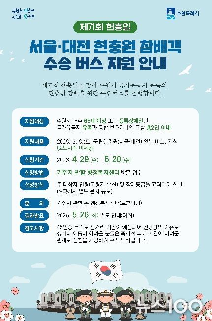 뉴스100 김동초 기자 | 수원특례시가 제71회 현충일인 6월 6일, 국립현충원(서울·대전)까지 이동이 여의치 않은 국가유공자 유족을 위해 현충원 왕복 수송버스를 운행한다.