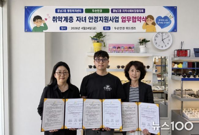 뉴스100 김동초 기자 | 광주시 광남2동 행정복지센터와 지역사회보장협의체는 지역 안경업체 두 손 안경 위드렌즈와 함께 취약계층 아동·청소년의 시력 보호와 학습환경 개선을 위한 안경 지원사업 업무협약을 체결했다고 28일 밝혔다.