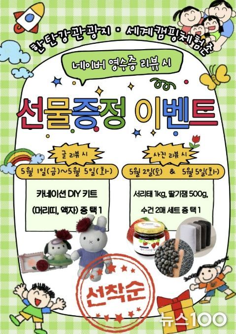 뉴스100 김동초 기자 | 연천군시설관리공단은 가정의 달을 맞이해 오는 5월 1일부터 5월 5일 내 한탄강관광지 오토캠핑장 및 세계캠핑체험존을 방문하는 가족 단위 관광객을 위한 참여형 이벤트를 운영한다.