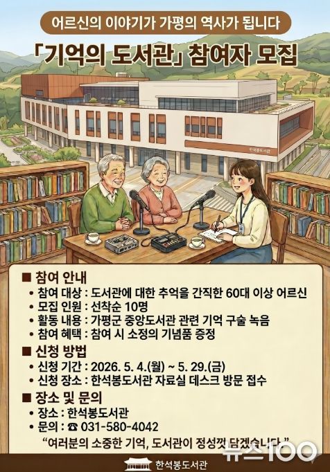 뉴스100 김동초 기자 | 가평군 한석봉도서관이 오는 5월부터 어르신들의 생생한 목소리로 지역의 옛 기록을 수집하는 ‘기억의 도서관’ 프로그램을 운영한다. 실버층 특화 사업인 ‘말랑말랑 추억 교실’의 일환으로 추진되는 이번 사업은 지역 문화 자산을 확보하고 세대 간 기억을 공유하고자 기획됐다.
