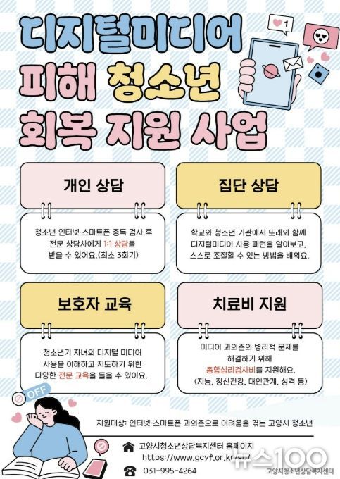뉴스100 김동초 기자 | 고양시청소년재단 산하 고양시청소년상담복지센터는 디지털 유해환경에 의한 청소년의 디지털 과의존 및 사이버 도박 등의 사회문제를 예방하고 치료하기 위해 오는 5월부터 12월까지 ‘디지털미디어 피해 청소년 회복 지원 사업’을 운영한다고 밝혔다.