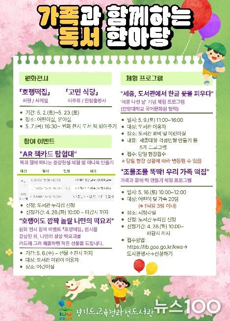 뉴스100 김동초 기자 | 경기도교육청과천도서관이 5월 가정의 달을 맞아 ‘가족과 함께하는 독서 한마당’을 운영한다.