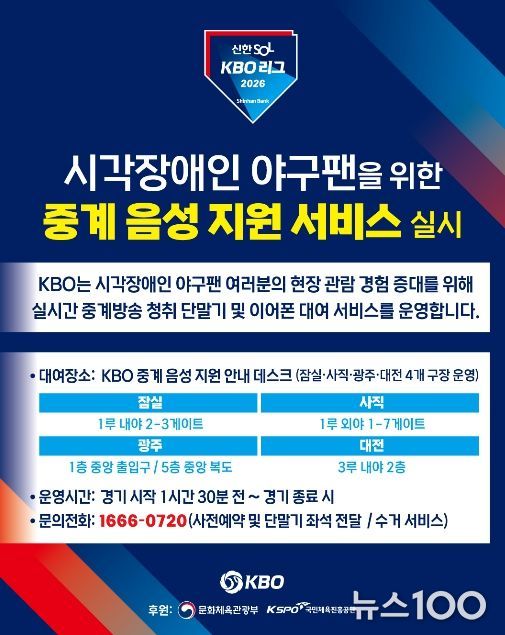 뉴스100 김동초 기자 | KBO는 2023년부터 잠실, 사직, 광주 구장에서 운영해 온 ‘KBO 리그 시각장애인 현장 관람객 대상 중계 음성 지원 서비스’를 올해 대전 한화생명 볼파크까지 확대해 총 4개 구장에서 운영한다.