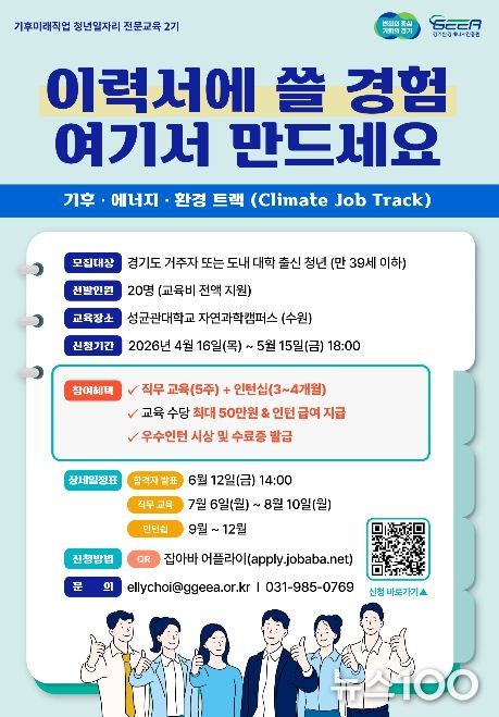 뉴스100 김동초 기자 | 경기도와 경기환경에너지진흥원은 도내 기후·에너지·환경 분야 기업 취업을 희망하는 청년을 대상으로 ‘기후미래직업 청년일자리 전문과정’에 참여할 교육생 20명을 5월 15일까지 모집한다.