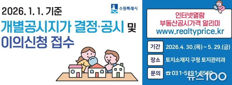 뉴스100 김동초 기자 | 수원시 영통구는 2026년 1월 1일 기준 개별공시지가를 4월 30일 결정·공시하고, 5월 29일까지 이의신청 기간을 운영한다.