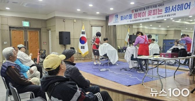 뉴스100 김동초 기자 | 수원시 팔달구 화서1동은 지난 28일, 대한미용사회 팔달구지회와 협력하여 관내 취약계층 어르신을 위한 ‘찾아오는 이미용 서비스’를 운영했다.