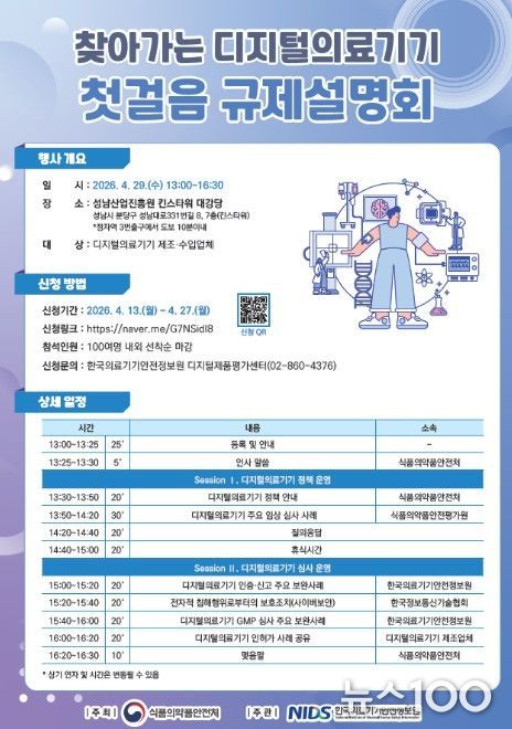 뉴스100 김동초 기자 | 식품의약품안전처는 디지털의료기기 분야 청년 기업이 밀집한 지역을 직접 찾아가 현장의 목소리를 청취하는 ‘찾아가는 규제설명회’를 4월 29일 성남산업진흥원 킨스타워(경기도 성남시 소재)에서 개최한다고 밝혔다.