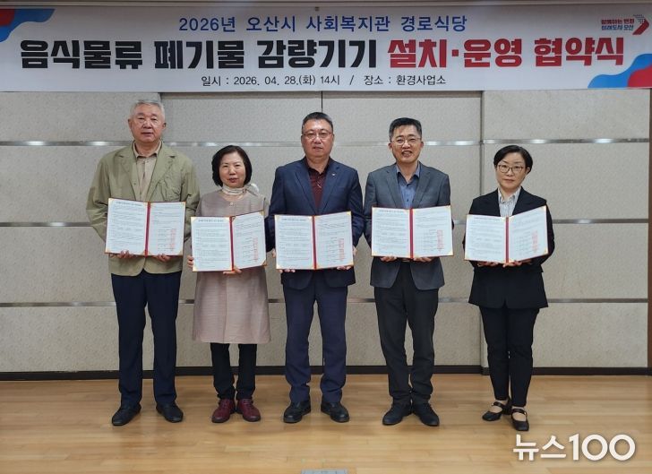 뉴스100 김동초 기자 | 오산시는 음식물류 폐기물 발생 저감과 자원순환 실천 강화를 위해 지난 28일 관내 사회복지관 경로식당을 대상으로 음식물류 폐기물 감량기기 설치·운영 협약을 체결했다고 밝혔다.