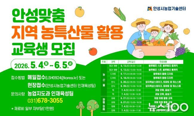 뉴스100 김동초 기자 | 안성시농업기술센터는 지역 농산물을 활용한 실습 교육을 통해 소비를 촉진하고 ‘지산지소(지역에서 생산된 농산물을 지역에서 소비함)’ 문화를 활성화하고자, 오는 5월 4일부터 6월 5일까지 교육생을 모집한다고 밝혔다.