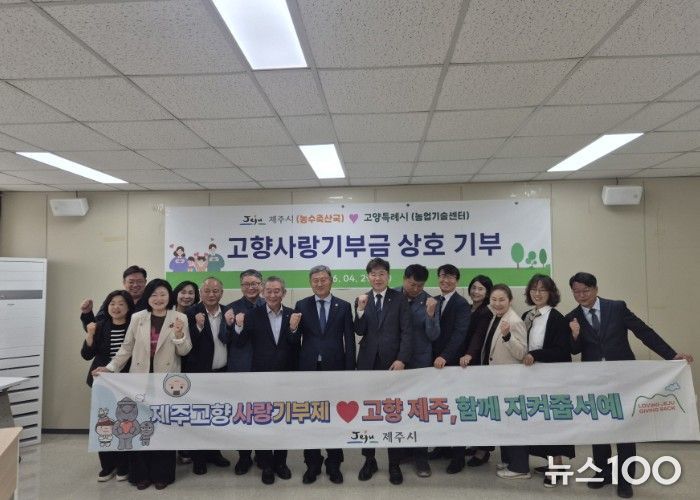 뉴스100 김동초 기자 | 고양특례시는 4월 29일 고양시농업기술센터에서 제주시 농수축산국과 함께 고향사랑기부금 상호 기부 전달식을 개최하고, 양 도시 간 상생 협력과 우호 증진을 다짐했다.