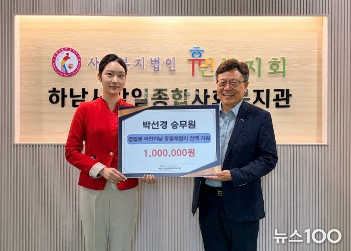 뉴스100 김동초 기자 | 박선경 승무원은 4월 26일, 하남시감일종합사회복지관에 감일동 어린이날 행사 운영을 위한 후원금 100만 원을 전달했다.