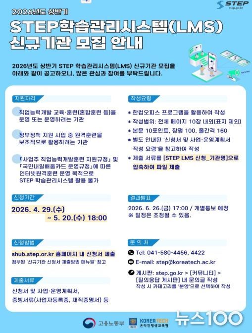 뉴스100 김동초 기자 | 한국기술교육대학교 온라인평생교육원(원장 한연희)은 고용노동부와 함께 2026년도 상반기 스텝(STEP) 학습관리시스템(LMS, Learning Management System)을 활용할 참여기관을 모집한다.