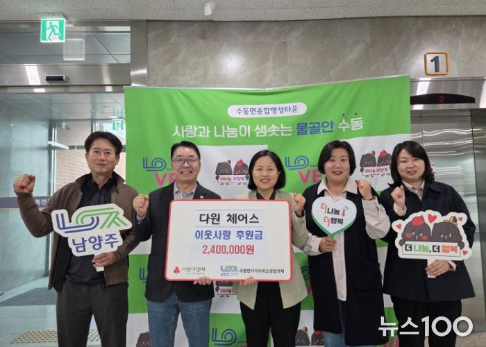뉴스100 김동초 기자 | 남양주시는 지난 28일 수동면 소재 다원체어스가 수동면 어르신들을 위한 후원금 240만 원을 수동면 지역사회보장협의체에 전달했다고 29일 밝혔다.