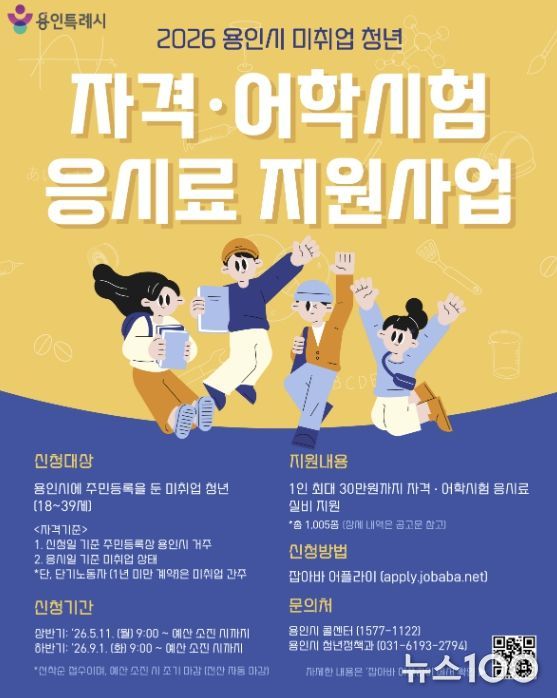 뉴스100 김동초 기자 | 용인특례시는 취업을 위해 어학과 자격증 시험 등을 준비 중인 청년을 위해 응시료 30만 원을 지원한다고 30일 밝혔다.