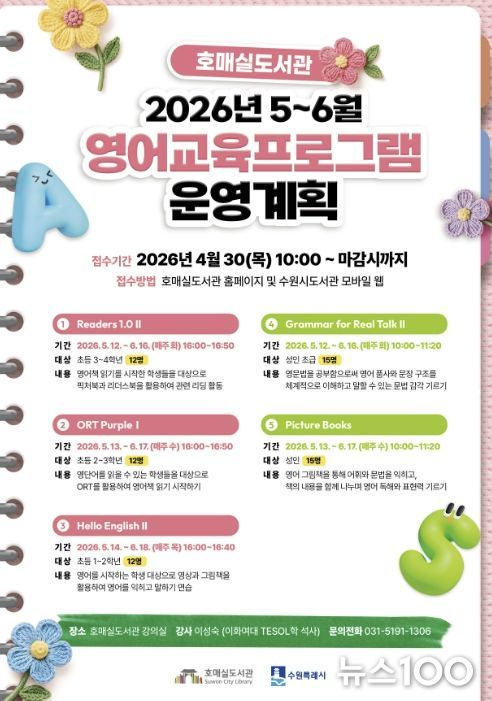 뉴스100 김동초 기자 | 수원시 호매실도서관이 5~6월 영어교육 프로그램 참가자를 모집한다. 이성숙 강사(이화여대 TESOL학 석사)가 강의한다.