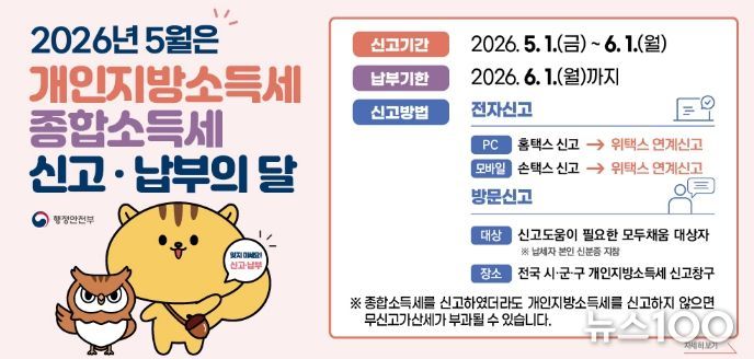뉴스100 김동초 기자 | 파주시는 납세자 편의를 위해 오는 5월 6일부터 6월 1일까지 파주시청 신관 1층 지방세민원실에 ‘종합소득세·개인지방소득세 신고 도움 창구’를 운영한다.