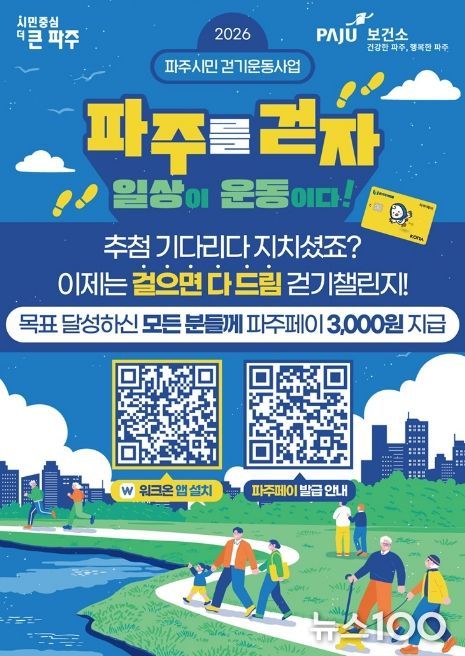 뉴스100 김동초 기자 | 파주시는 시민 건강 증진과 지역 경제 활성화를 위해 모바일 걷기 앱 ‘워크온 걷기 챌린지’특전(인센티브) 지급 방식을 전면 개편하고, 5월부터 시행한다.