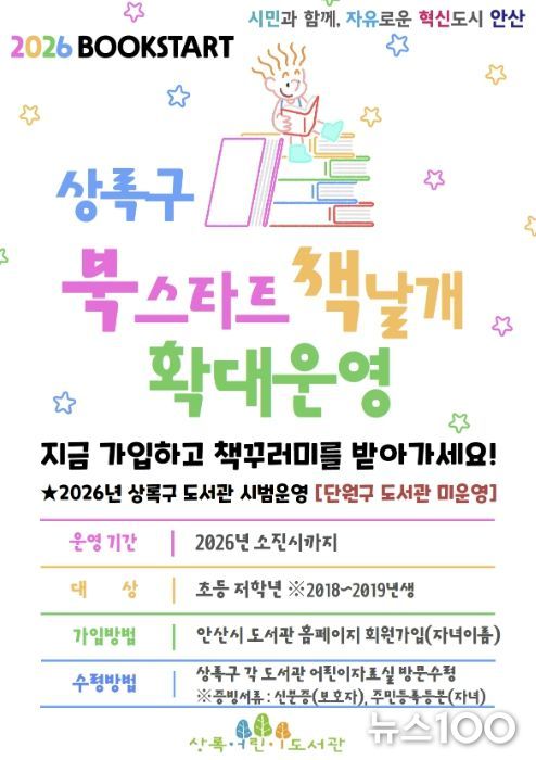 뉴스100 김동초 기자 | 안산시는 상록구 소재 도서관에서 운영 중인 ‘북스타트 사업’ 대상을 기존 영유아에서 초등학교 저학년 학생까지로 확대한다고 30일 밝혔다.