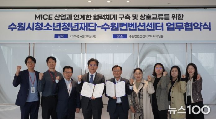 뉴스100 김동초 기자 | 수원시청소년청년재단(이사장 최종진)과 수원컨벤션센터가 4월 30일 양 기관의 상호 협력과 교류 확대를 위한 업무협약을 체결했다.