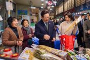 뉴스100 김동초 기자 | 이재명 대통령과 김혜경 여사는 오늘 낮, 설 명절을 앞두고 충북 충주시에 위치한 무학시장을 찾아 지역 세밑 물가를 점검하고 상인들을 만나 현장 의견을 청취했다. 무학시장은 지난 1978년 노점상들의 정착을 위해 개설된 전통시장이며, 이번 방문은 설 민심을 청취하기 위한 민생 행보의 일환이다. 이 대통령과 김 여사는 시장 내 여러 상점을 들러 “새해 복 많이 받으세요”라며 인사를 했고, 상인과 시민들은 환호와 박수로 이 대통령 부부를 맞았다. 이 대통령 부부에게 더덕을 판매한 상인은 “덕분에 마수걸이를 한다”며 “오늘 장사가 잘될 것 같다”고 말해 웃음을 자아냈다. 다른 상인들도 “힘나게 해주셔서 감사하다”, “너무 고생 많으시다”며 인사를 전했다. 이 대통령 부부는 황태포, 시금치, 곶감과 깐밤 등 제수용품과 먹거리를 구입했고 백도라지, 마른 멸치, 배추전 등을 즉석에서 맛보기도 했다. 이 대통령 부부는 온누리상품권과 현금으로 결제했다. 김 여사가 물건을 고르는 사이 이 대통령은 상인들에게 “장사는 잘 되느냐”, “곧 설인데 어떠시냐”고 물었다. 정육점 사장은