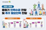뉴스100 김동초 기자 | 한국고용정보원(원장 이창수)은 '중장기 인력수급 전망'을 통해 향후 10년간 우리나라 노동시장의 인력공급(경제활동인구)과 인력수요(취업자)가 구조적으로 전환되는 양상을 전망하고, 향후 지속적인 성장을 위해 추가로 필요한 인력을 추계했다. 1.중장기 인력수급 전망(2024~2034) 주요 전망 결과를 보면, 15세 이상 인구 증가 폭은 과거에 비해 크게 둔화되고, 경제활동인구는 2030년부터는 본격적인 감소세로 전환될 것으로 나타났다. 저출생·고령화의 영향으로 생산가능인구(15~64세)는 지속적으로 감소하는 반면, 65세 이상 고령층 비중은 2034년 31.7%까지 확대되면서 노동 공급의 구조적 제약이 본격화될 전망이다. 이로 인해 15세 이상 전체 경제활동참가율은 전망 전기(‘24~’29년)에 감소 전환하는 반면, 고령층과 여성의 경제활동참가율은 점진적으로 상승할 것으로 예상되어, 노동시장 내 고령화 심화와 인력 구성의 질적 변화가 동시에 진행될 것으로 보인다. 2024년~2034년까지 취업자 수는 6.4만 명 증가하겠으며, 노동공급 제약의 영향으로 2030