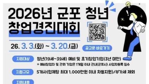 뉴스100 김동초 기자 | 군포산업진흥원은 지역 내 유망 청년 창업가를 발굴하고 혁신 아이디어의 성공적인 사업화를 지원하기 위해 2026년 군포 청년 창업경진대회 지원사업 참가자를 2026년 3월 3일부터 3월 20일까지 모집한다고 밝혔다. 이번 사업은 창의적인 아이디어와 기술력을 보유한 청년 예비창업자 및 초기 창업기업을 대상으로 우수 창업 아이템을 발굴하고, 단계별 맞춤 지원을 통해 안정적인 시장 진입과 지속 가능한 성장을 돕기 위해 마련됐다. 특히 경진대회를 통해 선발된 우수팀에게는 최대 1천만 원의 사업화 지원금과 전문가 멘토링 등 실질적인 성장 지원 프로그램이 제공될 예정이다. 또한 향후 창업보육센터 입주 신청 시 우대 혜택을 부여해 후속 성장까지 연계 지원할 계획이다. 군포산업진흥원은 이번 사업을 통해 청년 창업 활성화 기반을 더욱 강화하고, 지역 내 창업 생태계 선순환 구조를 구축해 나간다는 방침이다. 아울러 우수 창업기업이 관내에 안정적으로 정착해 지속적으로 성장할 수 있도록 맞춤형 지원을 확대해 나갈 예정이다. 유병직 원장은 “청년 창업은 지역 경제의 미래 성장 동력”이라며, “이