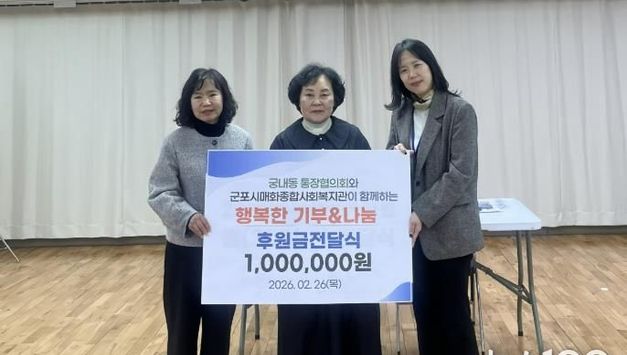 뉴스100 김동초 기자 | 군포시 궁내동통장협의회는 지난 2월 26일 매화종합사회복지관에 후원금 100만원을 전달했다. 이번 후원금은 소속 통장들이 매월 납부하는 정기 회비를 모아 마련한 것으로 지역사회 내 어려운 이웃을 돕기 위한 뜻을 모아 조성됐다. 전달된 후원금은 군포시 드림스타트에서 대상자를 선정해 취약아동의 심리치료비로 사용될 예정이다. 라의숙 회장은 “작은 정성이지만 도움이 필요한 아동들에게 실질적인 보탬이 되길 바란다”며 “앞으로도 지역사회와 함께하는 나눔 활동을 지속해 나가겠다”고 밝혔다. 매화종합사회복지관 관계자 역시 “지역사회를 위해 꾸준히 관심과 지원을 보내주시는 궁내동 통장협의회에 깊이 감사드린다”며 “후원금이 꼭 필요한 아동에게 투명하고 의미 있게 사용될 수 있도록 최선을 다하겠다”고 전했다. 한편, 궁내동 통장협의회는 매년 경기폴리텍고등학교와 협약을 맺고 100만원의 장학금을 지원하는 등 지역 인재 양성과 복지 증진을 위한 나눔 활동을 이어오고 있다. 지역사회와의 상생을 실천하는 궁내동 통장협의회의 행보가 따뜻한 울림을 전하고 있다. [뉴스출처 : 경기도 군포시]