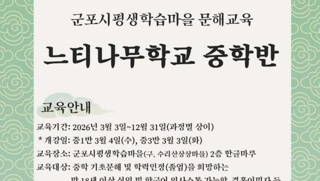 뉴스100 김동초 기자 | 군포문화재단 군포시평생학습마을은 지난 3일 성인 문해교육 프로그램 ‘느티나무학교’를 개강했다고 밝혔다. '느티나무학교'는 학령기 교육 기회를 충분히 누리지 못한 성인을 대상으로 운영되는 문해교육 사업이다. 읽기·쓰기·셈하기 등 기초학습을 비롯해 디지털 기초역량 교육을 단계별로 운영하여 일상생활에 필요한 문해능력 향상과 사회참여 확대를 지원하고 있다. 특히 고령 학습자 및 저학력 성인에게 배움의 기회를 제공함으로써 지역 내 교육격차 해소와 평생학습 기반 강화에 기여하고 있다. 특히 2026학년도에는 지난 10년간의 초등학력인정과정 졸업생들을 위해 중학과정 운영에 집중할 계획이며 이를 통해 학습자들이 단절 없는 배움을 이어갈 수 있는 성장 경로를 체계적으로 지원할 방침이다. 군포문화재단 전형주 대표이사는 “문해교육은 단순한 문자 습득을 넘어 삶의 질을 향상시키는 교육”이라며 “앞으로도 시민들이 지속적으로 성장할 수 있는 포용적인 평생학습 환경을 조성해 나가겠다”고 밝혔다. 군포문화재단은 문해교육을 포함한 다양한 평생학습 정책을 통해 시민의 보편적 학습권 보장과 지역 내 교육격