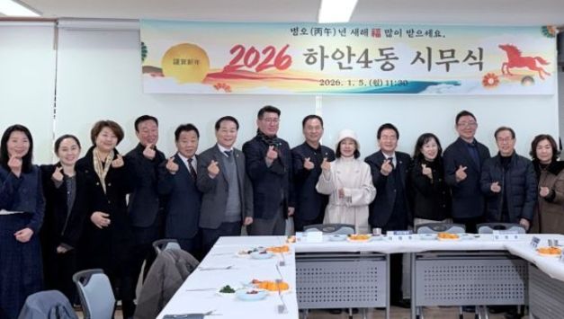 뉴스100 김동초 기자 | 광명시 하안4동 행정복지센터는 지난 5일 센터 2층 회의실에서 2026년 병오년(丙午年) 새해를 맞아 유관단체장과 마을연대활동가 등 30여 명이 참석한 가운데 시무식을 열었다. 이날 시무식은 지난해 적극적인 시정과 동정 활동으로 지역 발전에 헌신한 유관단체장과 활동가들에게 감사의 마음을 전하기 위해 마련했다. 참석자들은 새해 주요 업무 추진에 대한 의지를 다지며 하안4동의 도약과 화합을 기원하는 시간을 가졌다. 이재희 동장은 “유관단체의 적극적인 협조로 지난해 내실 있는 성장을 이뤘다”며 “올해는 소외된 이웃을 더욱 세심하게 살피고 주민 행복을 최우선으로 노력하겠다”고 말했다. 김성동 하안4동 단체장협의회장은 “2026년 새해에도 모든 주민이 행복한 하안4동을 만들기 위해 유관단체들이 한마음으로 협력하고 이웃사랑 실천에 앞장서겠다”고 말했다. 한편, 하안4동 행정복지센터는 시무식 종료 후 참석자들과 떡국을 함께 나누며 새해 인사를 전하고 소통과 화합의 의미를 더했다. [뉴스출처 : 경기도 광명시]