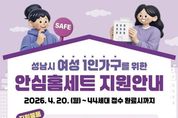뉴스100 김동초 기자 | 성남시는 여성 1인 가구의 범죄예방과 안전한 주거생활을 위해 ‘안심 홈세트 3종’을 지원한다고 16일 밝혔다. 지원 품목은 스마트 도어벨, 홈캠, 문열림 센서다. 대상은 성남시에 사는 여성 1인 가구 또는 한부모(모자, 부녀)가족이면서 전월세 보증금 3억원 이하의 다가구·다세대 주택 거주자다. 지원 물량은 44가구다. 시는 신청자의 자격요건 확인 뒤 대상 가구에 안심 홈세트를 선착순으로 지원한다. 희망자는 오는 4월 20일부터 성남시 홈페이지(시정소식→새소식) 또는 경기민원24 홈페이지(여성 1인가구 안심패키지 지원사업)를 통해 신청서와 임대차계약서 사본을 첨부해 보내면 된다. 시청 6층 여성가족과를 방문 접수하거나 담당자 이메일로 해당 서류를 보내도 된다. 성남지역 1인 가구 수는 3월 말 기준 전체 41만325가구의 39%인 16만661가구다. 이 중 여성 1인 가구는 48%인 7만7845가구다. 성남시는 2021년도부터 이 사업을 펴 지난해까지 5년간 576가구에 안심 홈세트를 지원했다. [뉴스출처 :