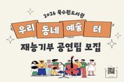 뉴스100 김동초 기자 | 북수원·대추골·일월도서관은 시민 참여 문화공연 ‘우리동네 예술 터’에 참여할 재능기부 공연팀을 4월 30일까지 모집한다. 모집 대상은 수원시 예술 동아리와 단체, 예술인으로 개인과 단체 모두 신청할 수 있다. 모집 분야는 ▲음악 ▲무용 ▲연극 등 다양한 장르의 공연이며, 지역 주민과 함께 나눌 수 있는 재능기부 형태의 공연이어야 한다. 정치적·종교적·영리 목적의 공연은 제외한다. 선정된 공연팀은 5월부터 12월까지 북수원·대추골·일월도서관 강당 등에서 공연할 수 있으며, 도서관은 공연 공간을 제공한다. 수원시 관계자는 “이번 사업은 이웃의 재능을 나누며 도서관을 소통의 공간으로 만드는 데 의미가 있다”며 “지역 예술인에게는 무대를, 시민에게는 문화 향유 기회를 제공하는 만큼 많은 참여를 바란다”고 말했다. [뉴스출처 : 경기도 수원시]